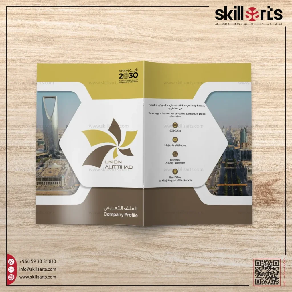 تصميم بروفايل احترافي لشركة Union Alittihad بالأسلوب المؤسسي الحديث، مع اعتماد ألوان ذهبية وبيج تعكس الفخامة والموثوقية. يشمل التصميم صفحات تعريفية، خدمات، رؤية ورسالة، إضافة إلى دمج العناصر البصرية بأسلوب متناسق يبرز هوية الشركة ويعزز حضورها أمام العملاء.