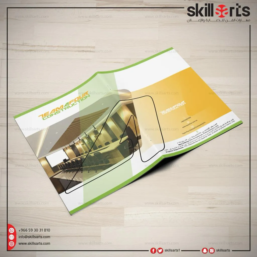 تصميم بروفايل احترافي لمؤسسة Team 4 Construction بأسلوب عصري يعتمد على الألوان الأصفر والأخضر لإبراز هوية الشركة في مجال المقاولات. البروفايل يعرض الخدمات، المشاريع السابقة، والرؤية الإنشائية بجودة عالية مع توزيع متوازن للنصوص والصور، مما يعكس احترافية الشركة وثقتها في قطاع البناء.